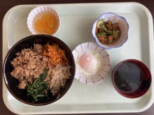 M&S大高亀原とデイケア大高亀原のお食事はM&S大高亀原の中にある厨房で管理しています。 今日は楽しみにしているオール手作りの日でした! 本日のメニューはビビンバ丼🎶 私は小鉢のキムチもビビンバ丼に乗せていただきました! 程よい辛さでとってもおいしかったです🎶